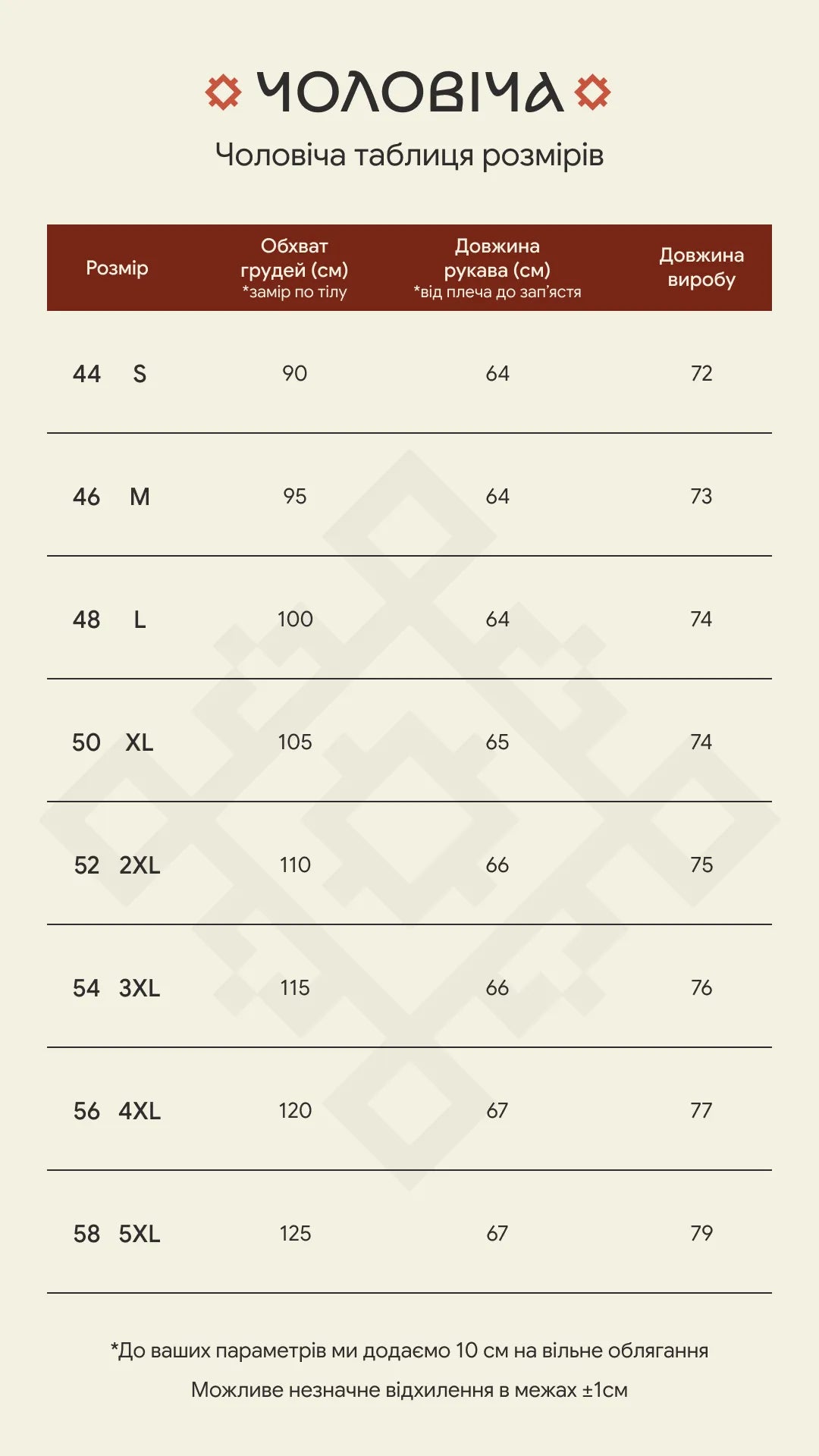 Пошиття: зберігаємо традиції завдяки власному виробництву і шиємо відповідно до нашої розмірної сітки до розміру 5XL. В даній моделі прибавка на вільне облягання по лінії грудей - 10 см. Cорочка має розрізи по боках, манжет на гудзику.